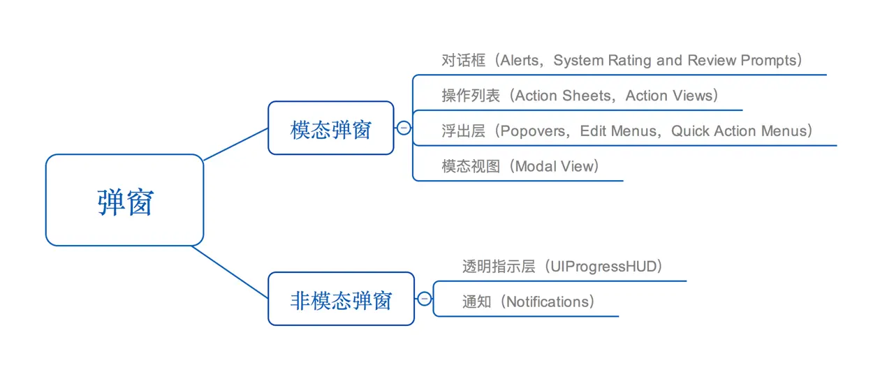 根据是否运用模态视图,我把收集到的所有iOS的弹窗类型进行如下分类: