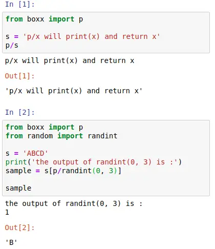 💡 Note: boxx.p 使用了 magic method, p/x 便会打印 x 并返回 x。这样便可以在任何地方打印,比如 例子中的 p/randint(0, 3) 就不需要新建变量便可直接打印