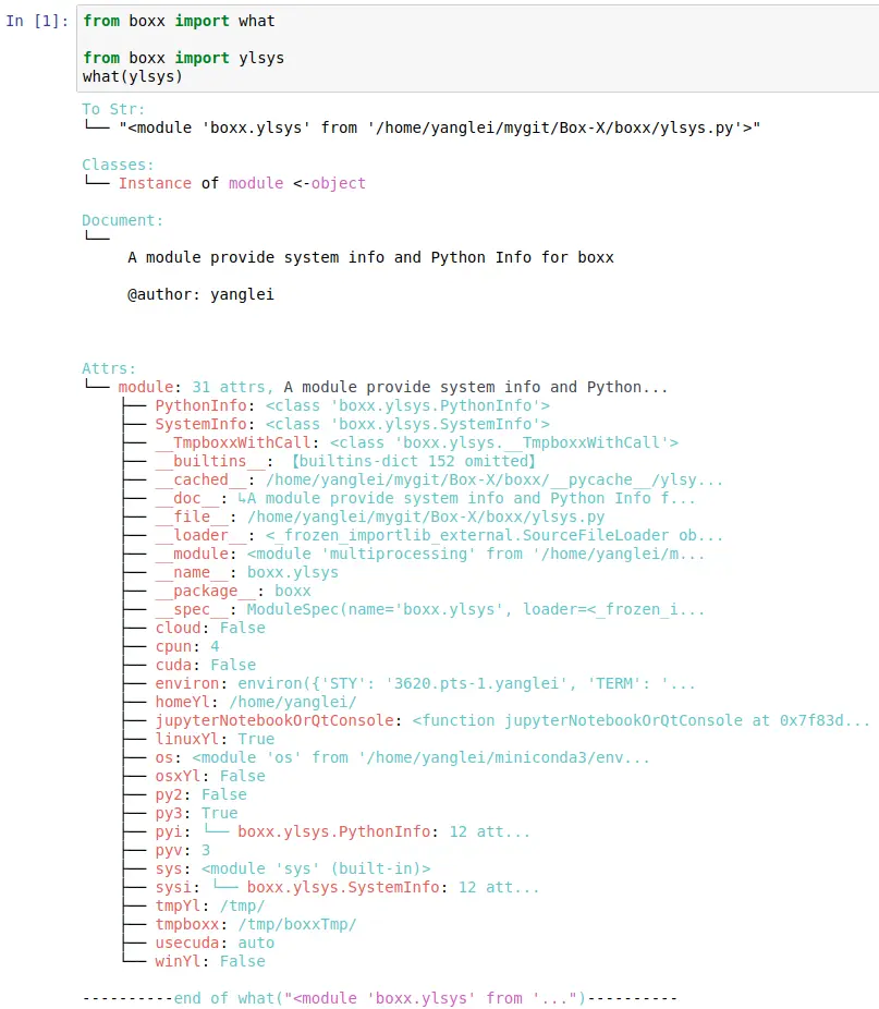 在学习新框架或适配大佬代码时,经常会使用 print(x), dir(x), help(x), type(x) 来了解某个变量的各方面的信息 (变量可能是 值/function/class/module 等),于是我写了一个 boox.what(x) 来全面了解"what is x?":