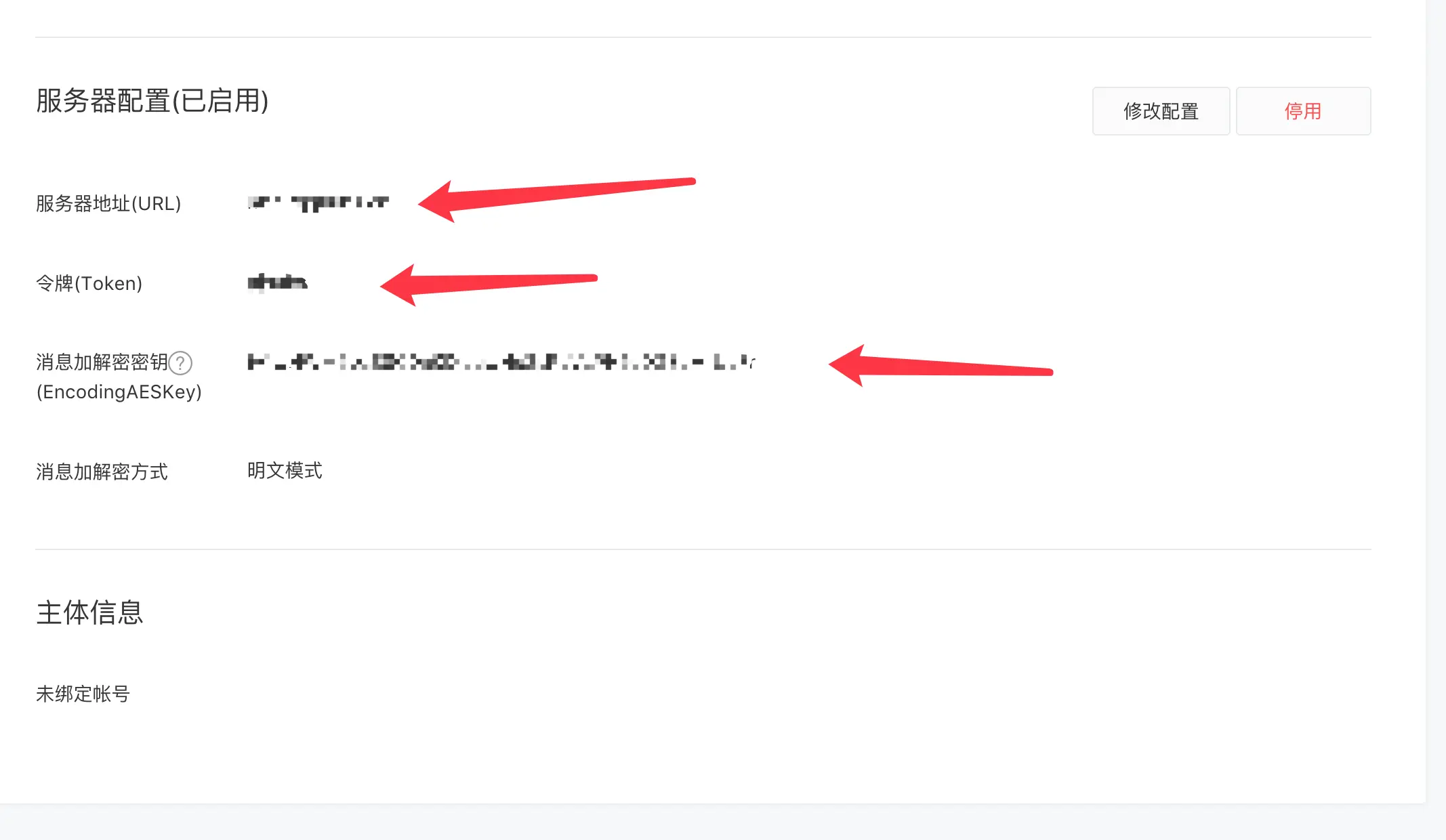 # 填写上一步在微信公众号的配置内容