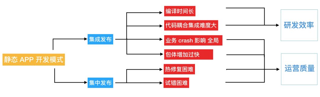 这种“静态”的开发模式,会对研发效率和运营质量产生负面影响。对于传统的桌面应用软件开发而言,静态的研发模式也许是相对可以接受的。但对于业务蓬勃发展的移动互联网行业来说,静态开发模式和敏捷迭代发布需求的矛盾日益突出。