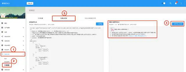 登录 Mob开发者后台 ,选择MobLink项目,确认相关配置项无误后选择页面配置,切换到引用JS文件选项卡,点击微信小程序专用JS对应的一键下载JS文件按钮,下载MobLink提供的JS文件,如下图: