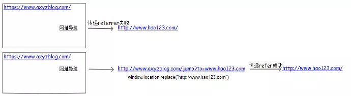 可以采用再次跳转的方法,既然 HTTPS 下不能给 HTTP 传递 referer,我们可以先从 HTTPS 访问一个可控的 HTTP 站点,把需要传递的内容放到这个 HTTP 站点的 url 中,然后再跳转到目标地址。