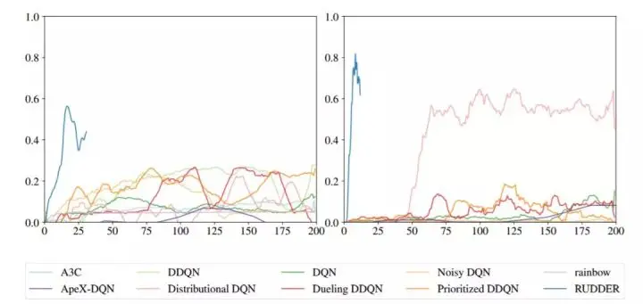 图 3:RUDDER 学习 Atari 游戏 Bowling 和 Venture 的延迟奖励的速度比其他方法快。左图是 Bowling 游戏训练过程中各个方法的归一化人类得分,右图是 Venture 游戏训练过程中各个方法的归一化人类得分,其中学习曲线来自于之前的研究 [39, 50]。RUDDER 在 Bowling 游戏上达到了新的当前最优性能。