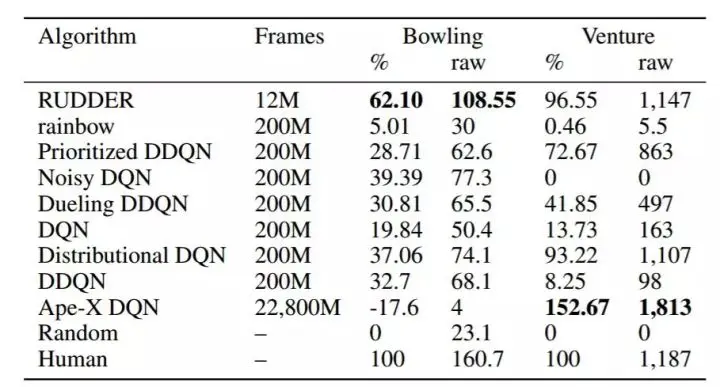 表 1:RUDDER 和其他方法在学习 Atari 游戏 Bowling 和 Venture 时的结果。在无操作指令开始条件下,各个方法在超过 200 个测试游戏中的归一化人类得分和原始得分:A3C 得分未报道,因为其在无操作指令开始条件下无法获得。其他方法的得分来自于之前的研究 [8, 39]。我们选择了仅基于 12M 帧训练损失的 RUDDER 模型。
