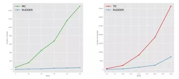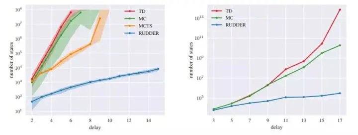 图 2:不同方法在不同延迟下学习达到 90% 返回奖励的最佳策略的观察状态数(对数坐标)。我们对比了由 Q 学习实现的时序差分(TD)、蒙特卡洛(MC)、蒙特卡洛树搜索(MCTS)和 RUDDER。左:Grid World 环境。右:Charge-Discharge 环境。RUDDER 和其他方法所需状态的差距随着延迟步数的增加呈现指数级增长。