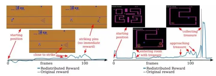 图 4:RUDDER 在具备较长延迟奖励的两个 Atari 游戏中的返回值分解示意图。左:在 Bowling 游戏中,仅在一个 turn(包含多次滚动)后给予奖励。RUDDER 识别引导球沿着正确方向击中瓶子的动作。一旦球击中瓶子,RUDDER 随即检测与击中瓶子相关的延迟奖励。图中只展示了 100 帧,但是整个 turn 的长度超过 200 帧。在原始游戏中,奖励是在 turn 结束时才给予。右:在 Venture 游戏中,只在收集到宝藏后才给予奖励。RUDDER 通过奖励再分配引导智能体(红色)前往宝藏处(金色)。奖励在进入有宝藏的房间时进行再分配。此外,随着智能体离宝藏越来越近,再分配奖励逐渐增加。为简洁起见,图中绿色曲线展示了在使用 lambda 之前的再分配奖励。环境仅在收集宝藏结束时才给予奖励(蓝色)。