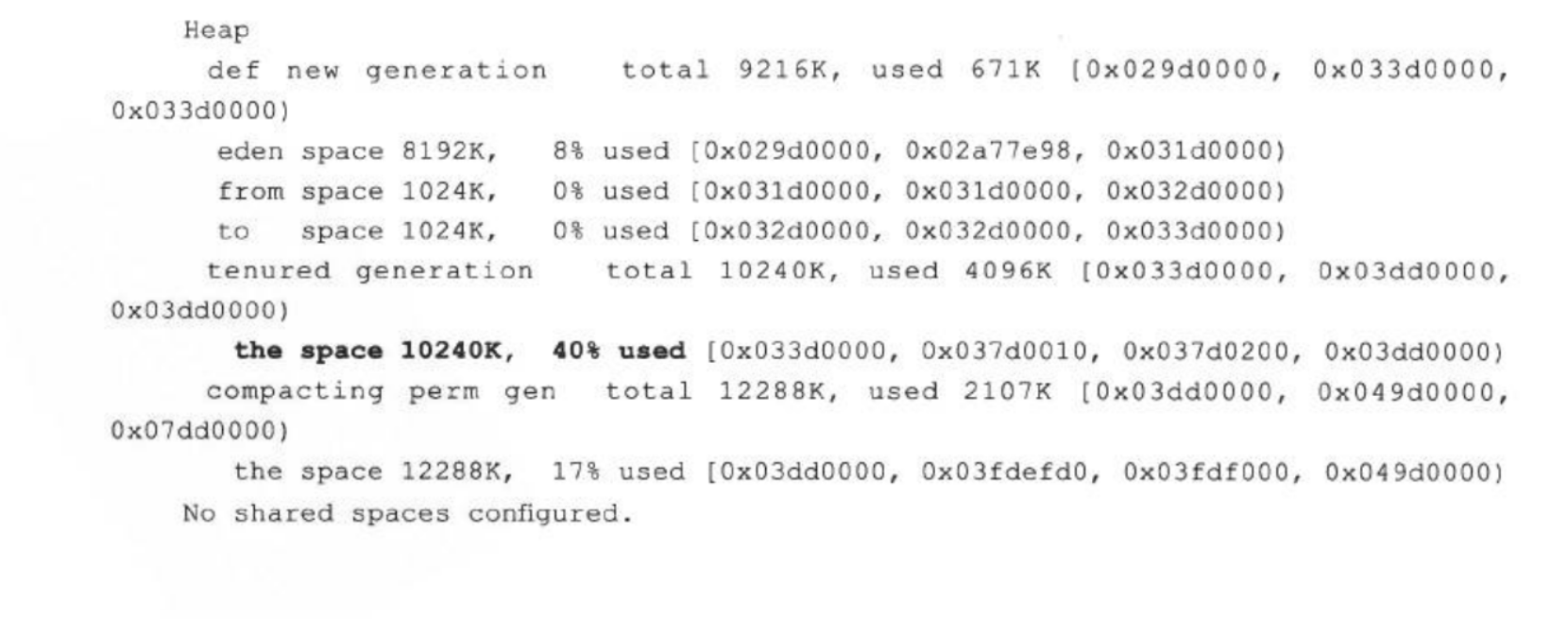 Eden区与一个Survivor区的空间比例为8:1,从输出的结果可以看到eden space 8192K,from space 1024K,to space 1024K,的信息,新生代总可用空间为9216KB(Eden+1个Survivor的总容量)。
