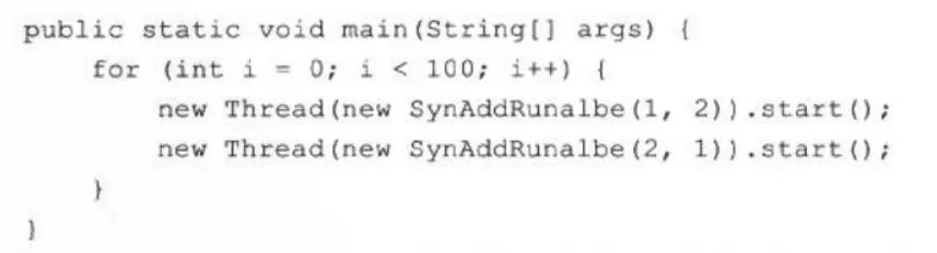 代码中调用200次Integer.valueOf()方法一共就返回了两个不同的对象。假如在某个线程的两个synchronized块之间发生了一次线程切换,那就会出现线程A等线程B持有的Integer.valueOf(1),线程B又等待着被线程A持有的Integer.valueOf(2),结果大家都跑不下去。