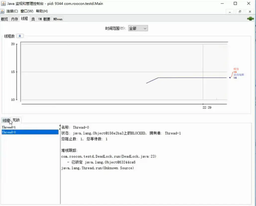 出现思索后,点击Jconsole线程面板的检测到死锁的按钮,将出现一个新的死锁标签。如下图:
