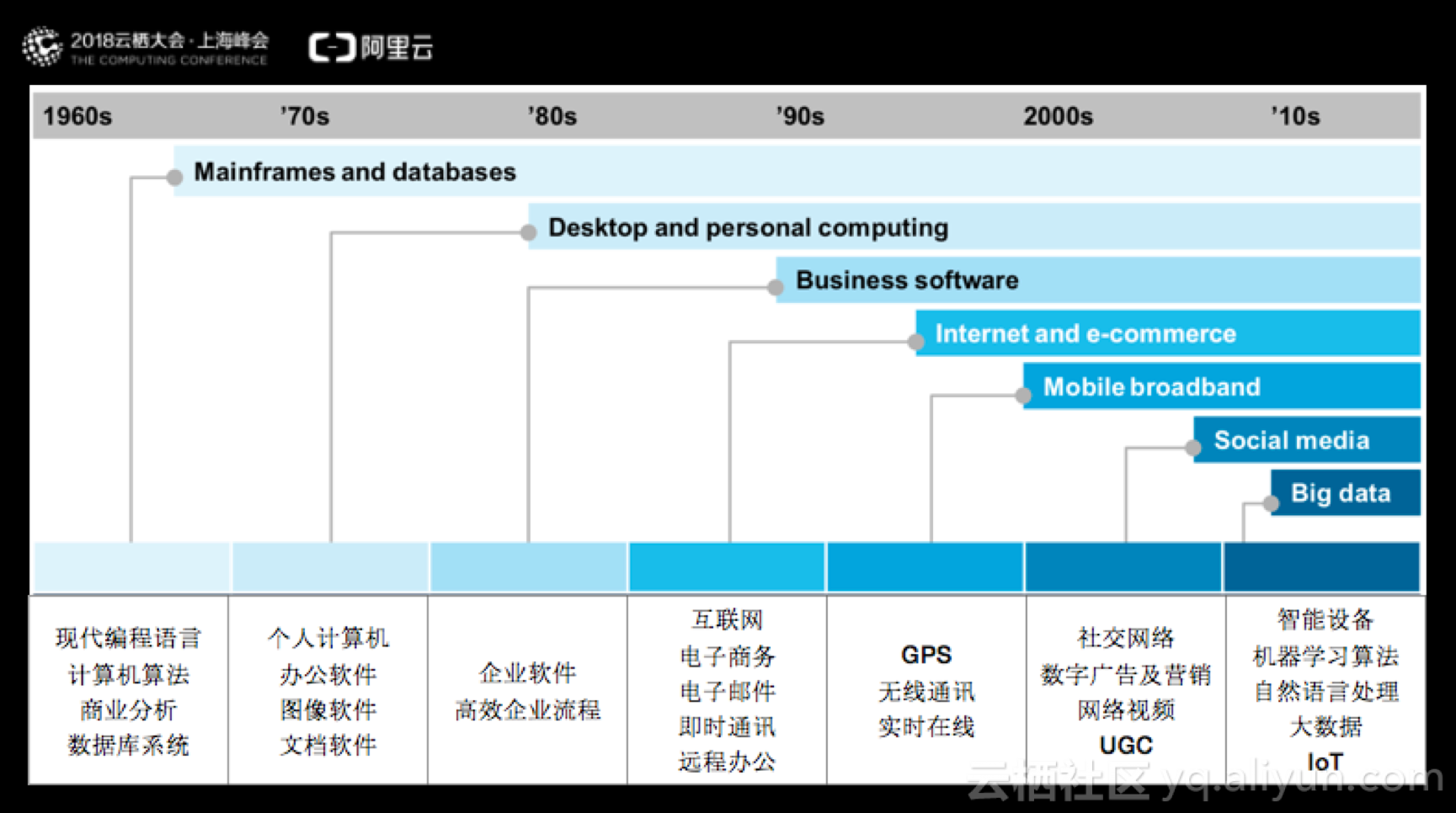 纵观历史,从60年代开始,最开始有了大型机及数据库,带来了在编程语言和计算机算法方面的技术进展,带来了商业分析、数据库系统的商业模式产出。到了70年代出现了个人电脑,每个人的工作效率逐渐增强,到80年代开始有了商业软件,使企业流程有了很大的提升,从90年代开始,有了互联网和电子商务,即时通讯使个人工作效率极大提高。2000年左右开始有了移动宽带,人实时在线,随时与别人互联。之后很快,我们有了社交网络,催生了数字广告,商业营销与变现从传统的线下转移到了线上。网络视频也随之出现,从最初的UGC视频平台,逐渐渗入到各行各业,人们开始用视频来了解世界、分享生活。而在2010年之后,大数据、人工智能、机器学习这些算法又带来了新的创新,视频和语音不再单纯是内容载体,它变成了一种可以去索引、搜索、联想、分析的能产生更多价值的存在。