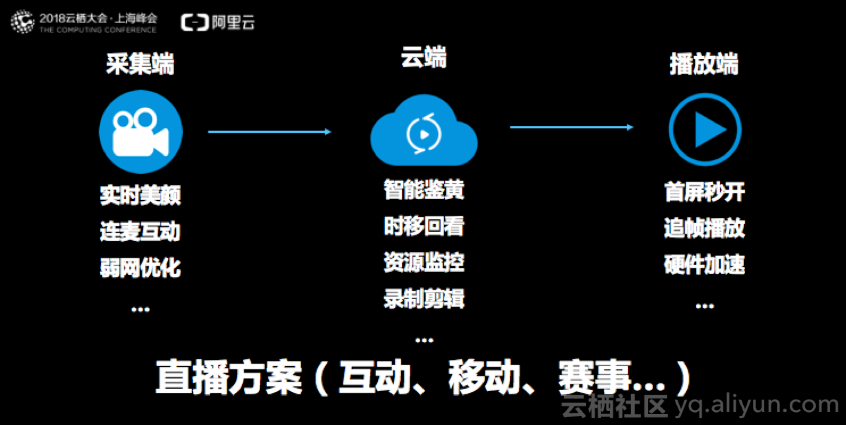同时,阿里云提供采集、播放端的SDK到云端的整套服务,常见的互动直播、移动直播、赛事直播都可以采用这套方案,快速上线。