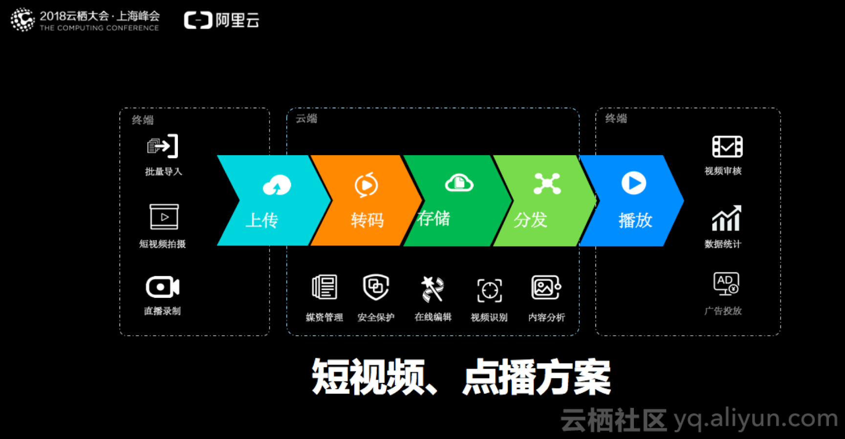 如果用户不想花费太多精力去开发和维护视频应用,那也可以采用一站式的视频解决方案。下图中的短视频、点播解决方案,就包括了从终端视频导入、拍摄了,到云端的媒体管理、安全保护、在线编辑、视频识别,再到终端的播放、审核与统计等等,用几天的时间就可以搭建起一个完整的视频应用。