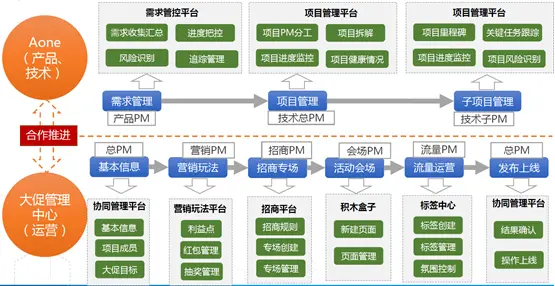 要应对几何级增长的大促要跨多个团队协同,有非常多的干系方,包括运营、产品、技术、规则、法务、渠道、销服及客满等,且大促的战线拉的非常长,从前期的招商、营销玩法、会场搭建、氛围配置、流量分配等,为了让PM能关注到各自负责的主业务,且交叉的细节不会有遗漏,摸索出了云效+大促管理中心的线上项目管理模式,能让各角色在系统上完成信息流转和确认,才能保证大促不出问题且有确定性。如图2所示。