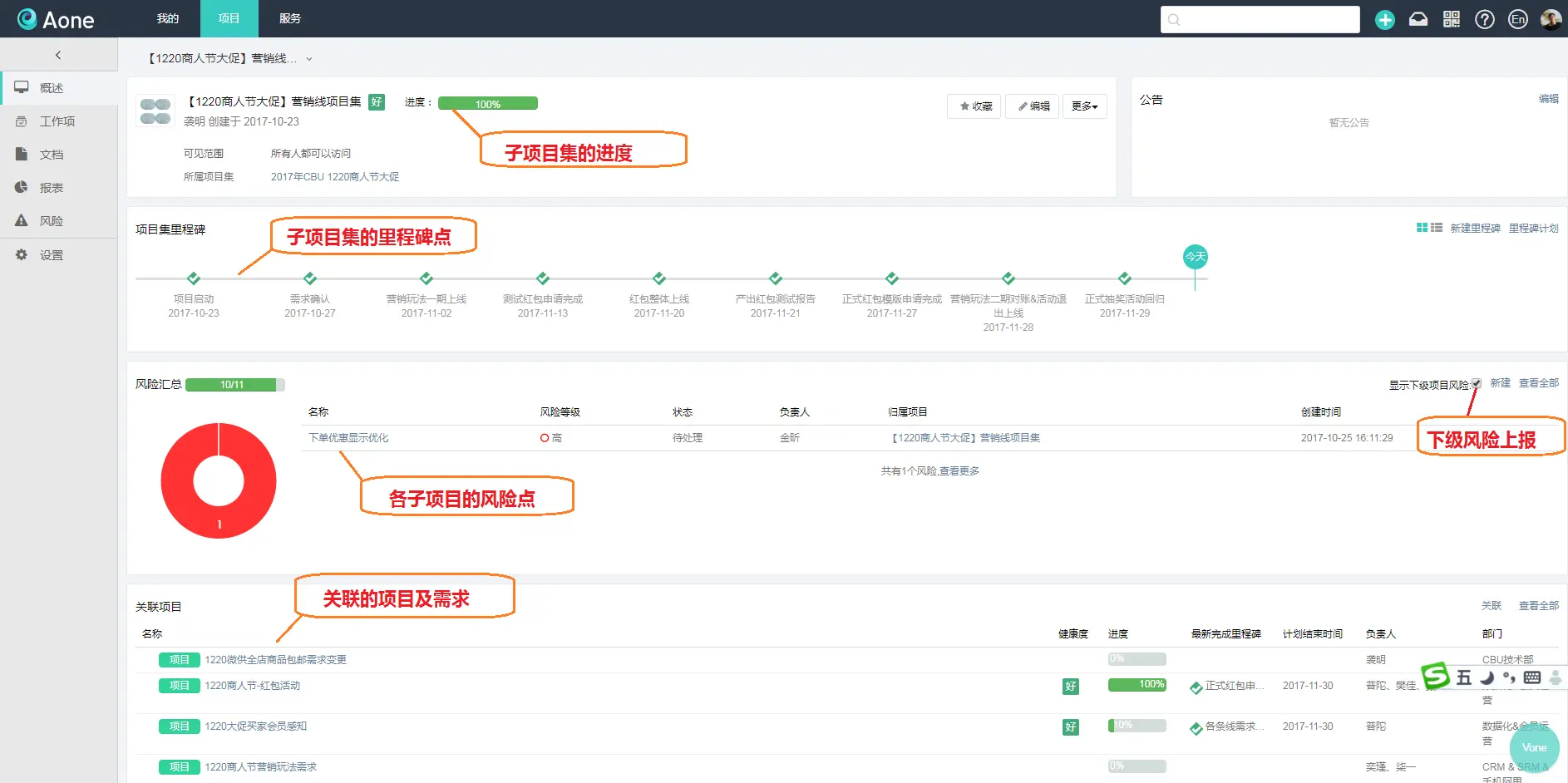一般经过这几个步骤的设置,各个PM包括老板即可非常清晰的看到一次大促的进展、风险及各个模块的健康情况。当然系统里面实现的只是一个工具,能方便大家更透明的做项目管理,且将流程和标准做到系统中。但真正要做到一次大促不出问题且有较强的确定性,很多时侯还是要靠PM及开发同学的责任心及相互补位才能做到。