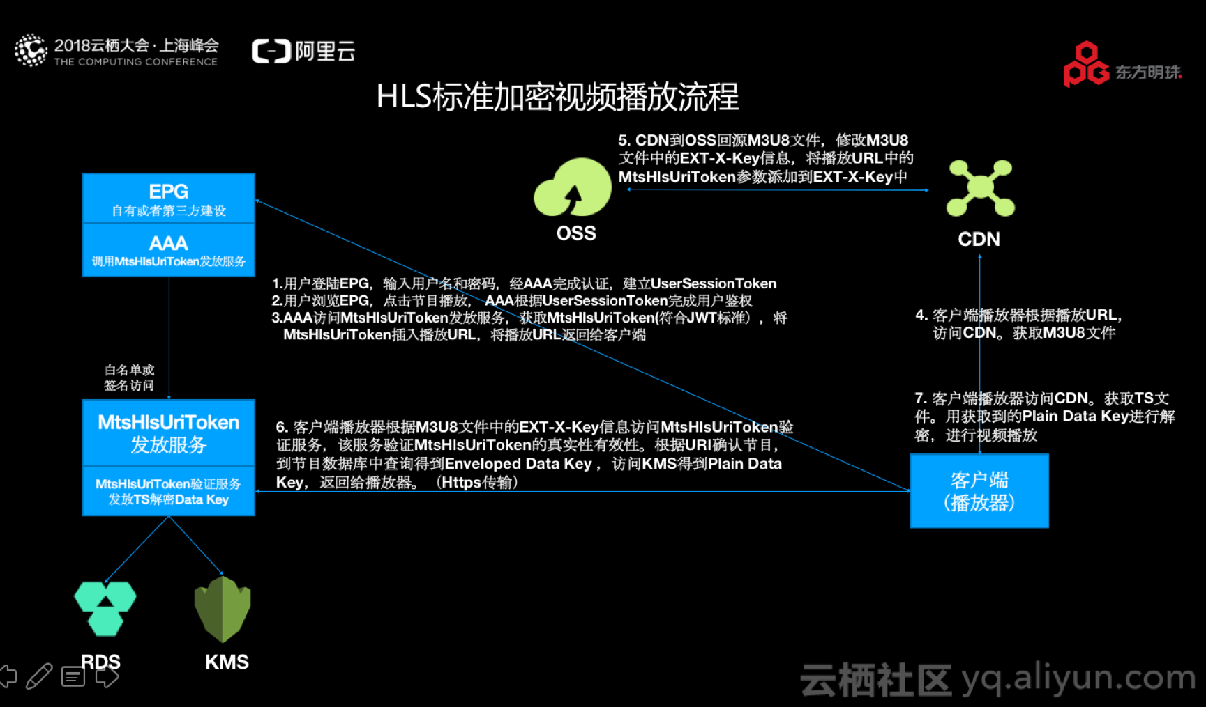 HLS标准加密视频加密流程相对比较简单,从KMS拿到密钥,告诉VOD,VOD把这个视频加密,并且把加密密钥写在RDS中就好了,整个加密在转码过程很高效地就完成了。