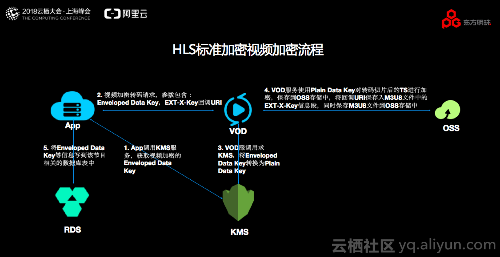 除了VOD HLS标准加密解决方案之外,东方明珠视频SaaS平台也采用阿里云标准大数据解决方案,整个过程如下图。