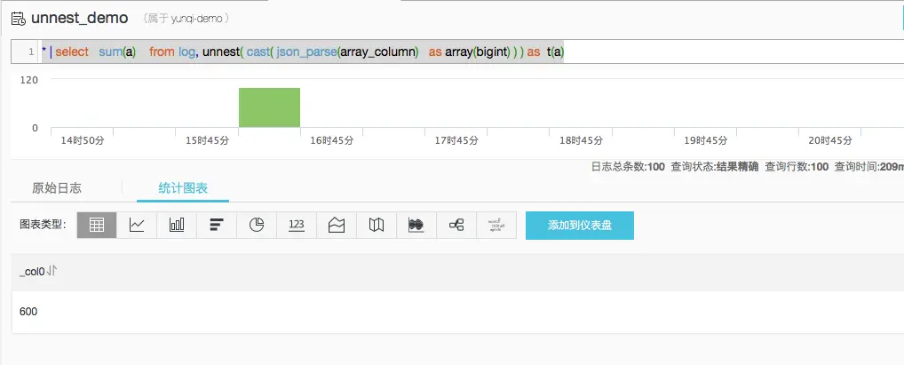 * | select histogram(method)是一串json,无法配置视图展示,我们可以用unnest语法,把json展开成多行配置视图,例如: