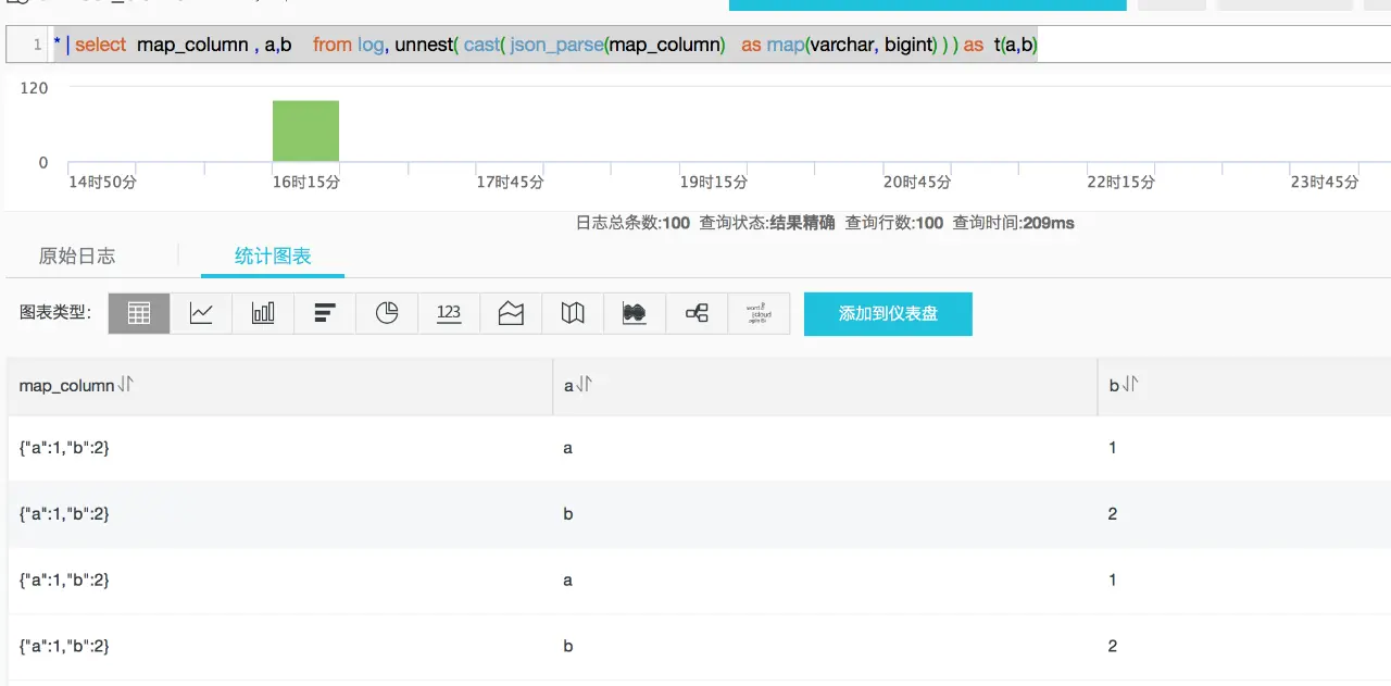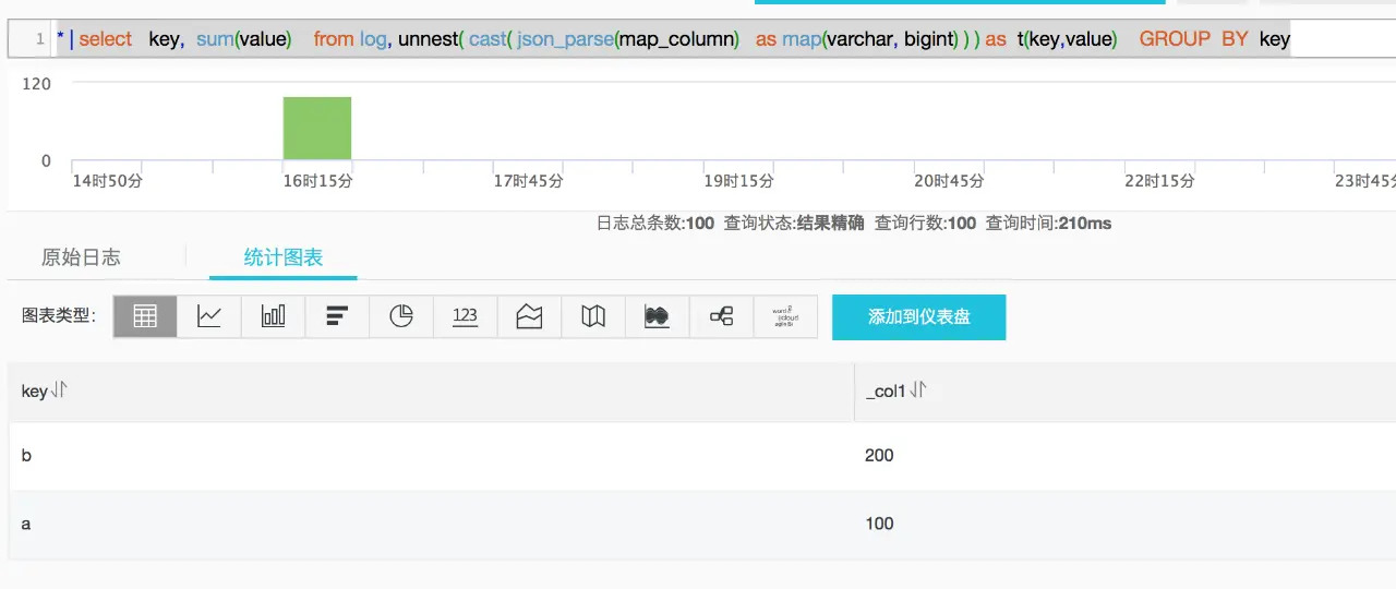 * | select map_column , a,b from log, unnest( cast( json_parse(map_column) as map(varchar, bigint) ) ) as t(a,b)- 按照Map的key进行group by 统计