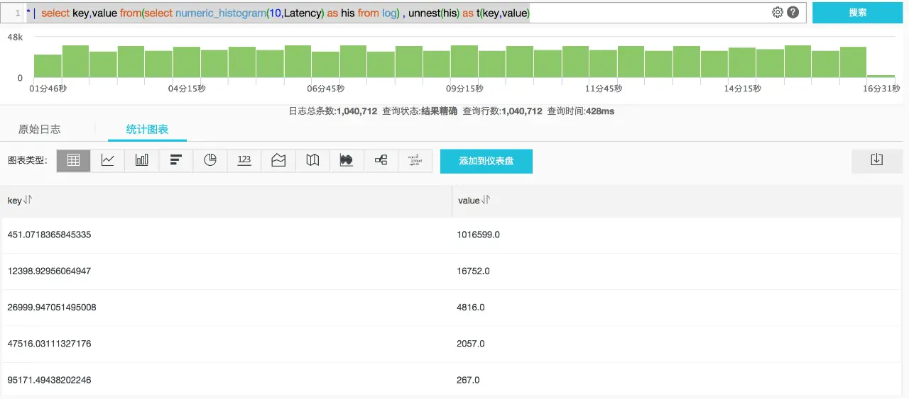 * | select key,value from(select numeric_histogram(10,Latency) as his from log) , unnest(his) as t(key,value)结果如下:
