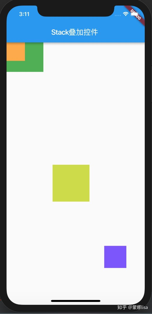 上面这段代码显示出来的小部件都叠加在一起,默认对齐方式是左上角,Stack控件本身包含所有不定位的子控件,