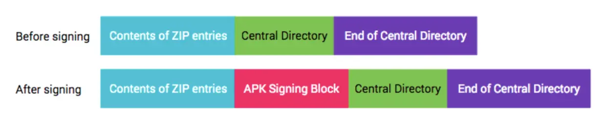 新应用签名方案的签名信息会被保存在区块(APK Signing Block)中, 而区块(Contents of ZIP entries)、区块(ZIP Central Directory)、区块(ZIP End of Central Directory)是受保护的,在签名后任何对其的修改都逃不过新的应用签名方案的检查。