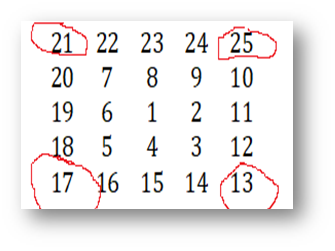 从数字1开始向右顺时针方向移动,可以得到如下的5×5的螺旋: