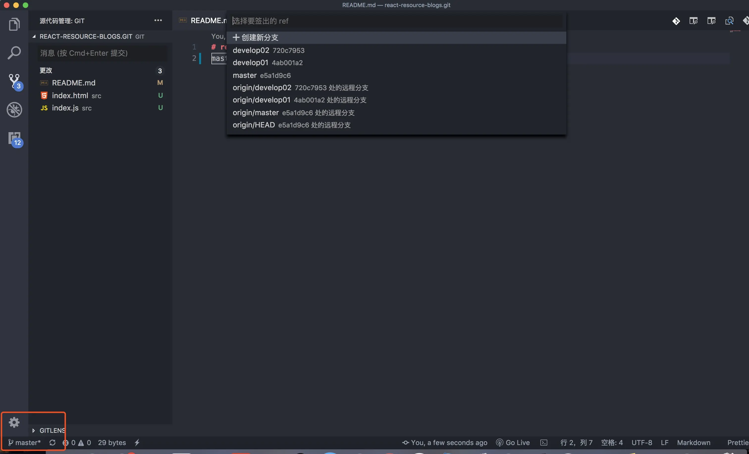 这里我以GitHub上面新建的一个仓库为例,仓库新建后默认分支是master,这里我在GitHub上新建了2个远程分支develop01和develop02,当你在VS Code中点击切换到某一个远程分支的时候,VS Code会自动给你创建一个和当前远程分支对应的本地分支,如origin/develop02 对应develop02,如origin/master 对应master,如上图所示。