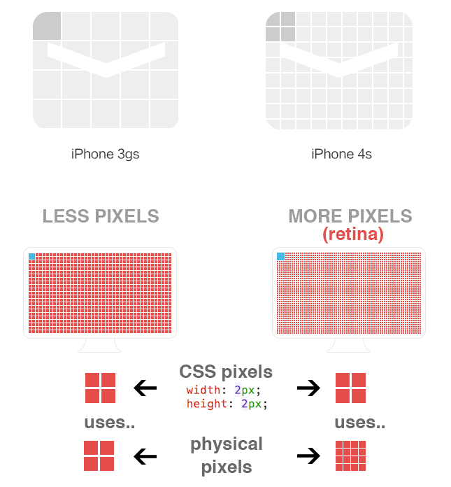 也叫虚拟像素,它是一种相对单位,相对于实际的物理像素,我们的开发中使用的单位将会是逻辑像素,不是物理像素。而iphone中逻辑像素是以iphone3的分辨率为基础(320x480)。也就是说,在iphone3中,1px的逻辑像素等1px的物理像素。但到了iphone4(640x960)中,它会变成1px逻辑像素用2px物理像素来表示了,这样的话,iphone3中元素的的大小(160px,240px)到iphone4(160x2px,240x2px)中展示的大小是不是也一样了。盗图: