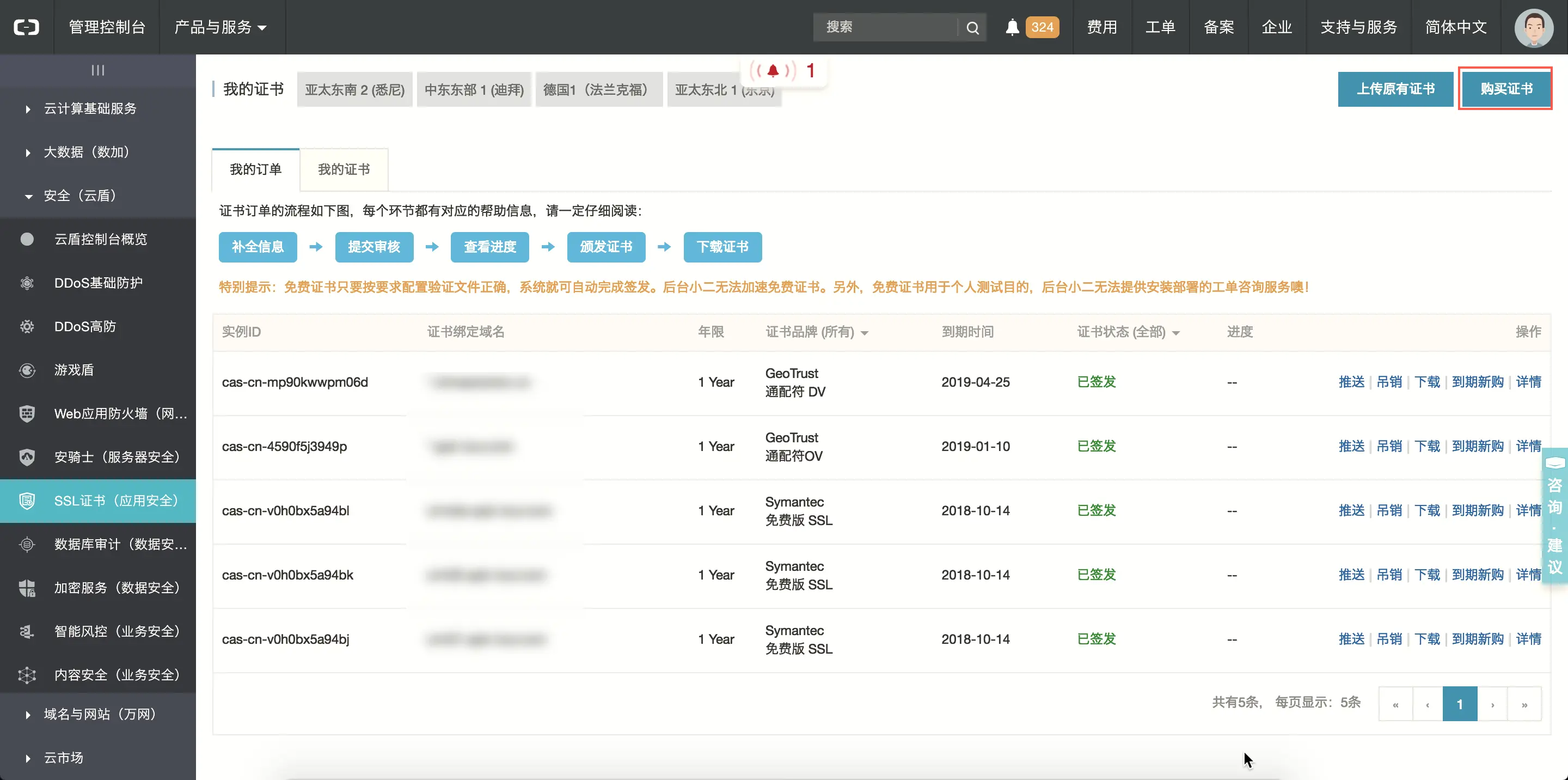这里以在阿里云上购买免费 SSL 证书为例,首先登录阿里云控制台,进入安全(云盾)-> SSL证书(应用安全),点击购买证书。