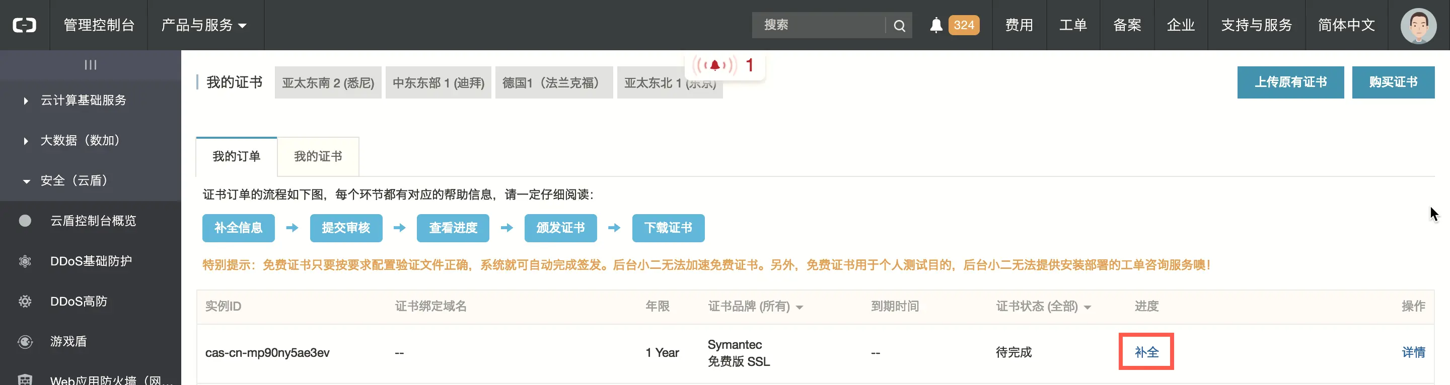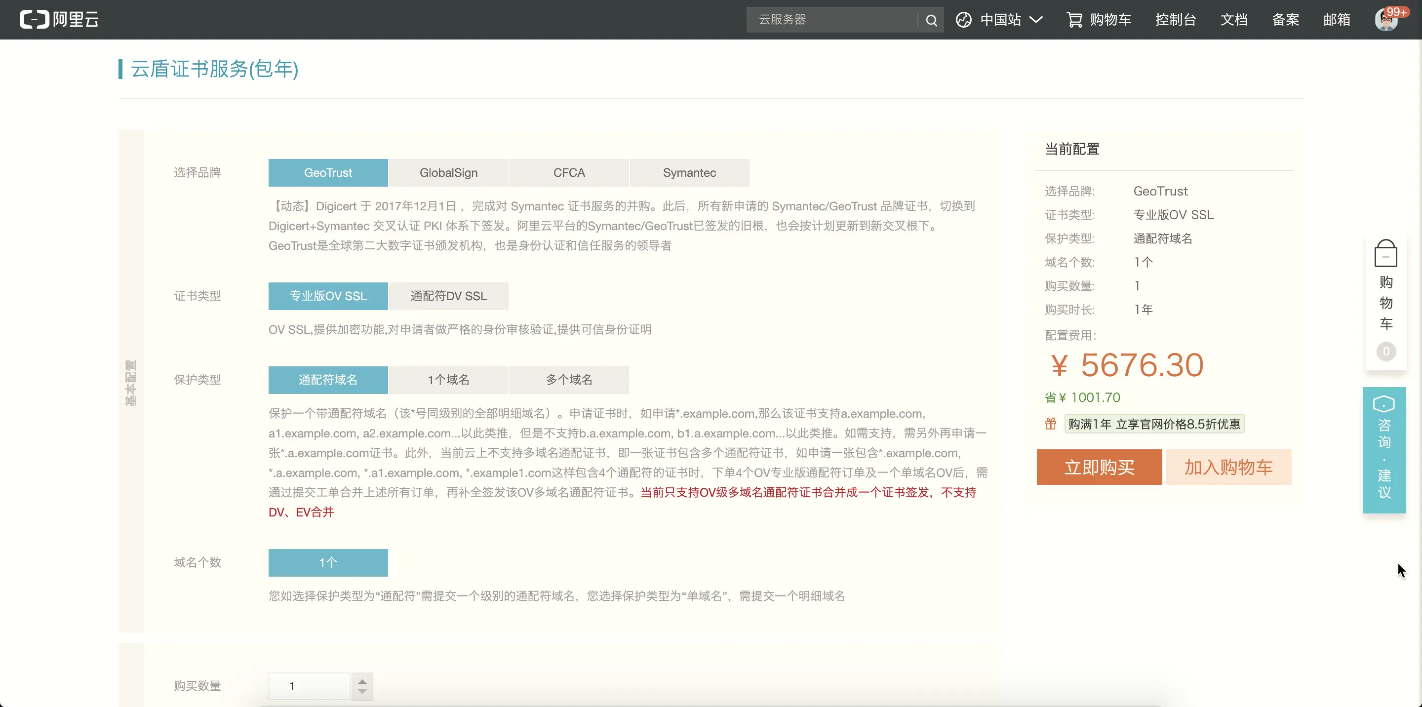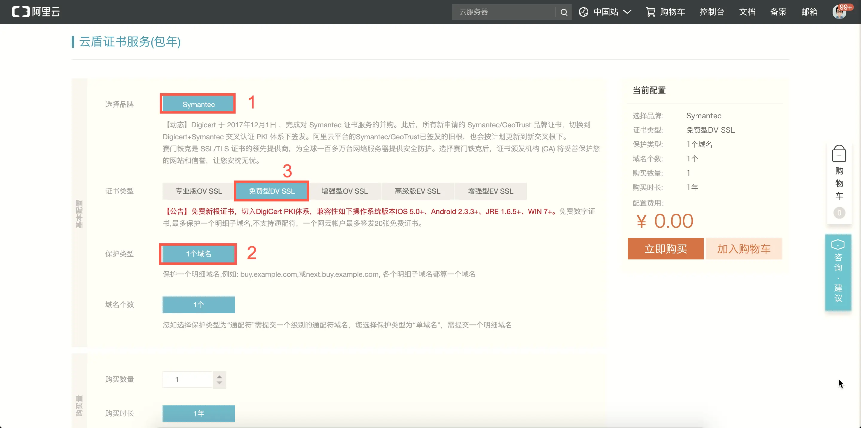 好吧,我是穷人,只能看看有没有免费证书。其实是有的,依次点击Symantec -> 1个域名 -> 免费型DV SSL,成功激活30人:)