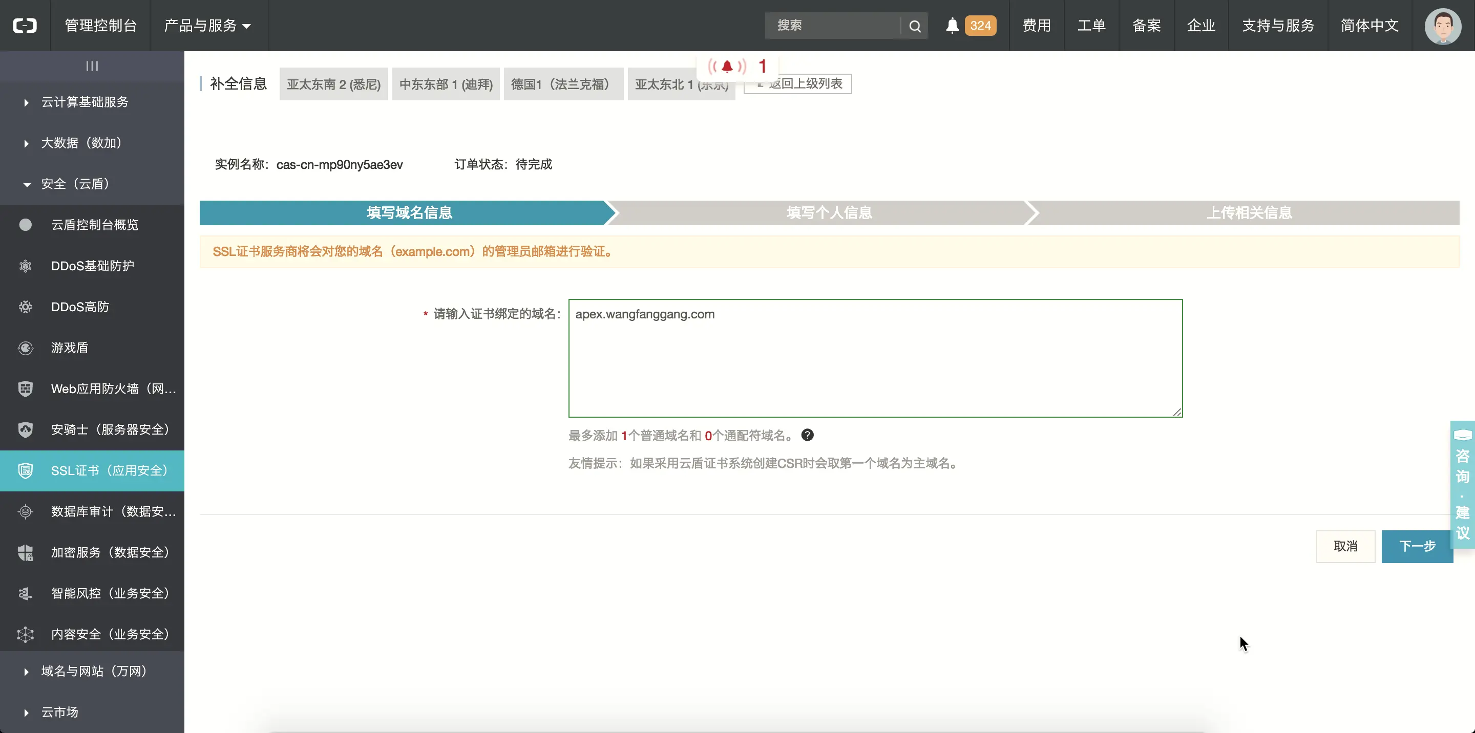 **钢哥提示:**由于我们申请的是阿里云的免费证书,只能作用于一个固定域名,一般我们都不会把主域名用来放置APEX应用,所以这里可以填写诸如:apex.xxx.com 的二级域名。如果你想要免费通配符域名,可以移步这里:使用Let’s Encrypt给网站加上免费HTTPS证书