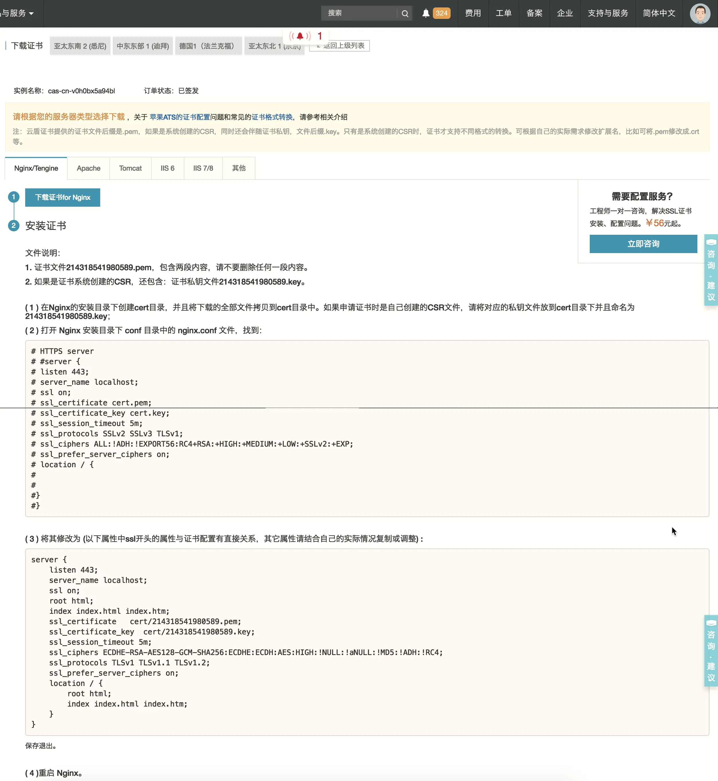 将 SSL 证书添加进nginx.conf,按照下载证书页面的提示配置 Nginx: