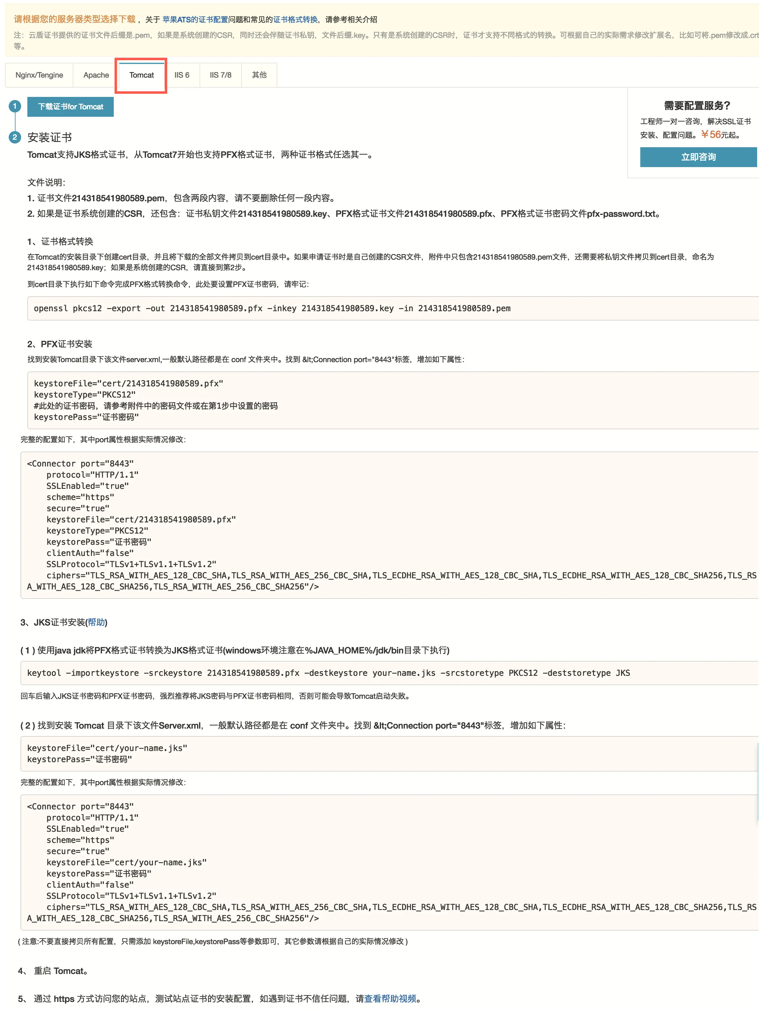 经过跟同事几天的研究,发现除了要在 Nginx 上启用 SSL 证书以外,还必须在 Tomcat 上也启用。还是回到阿里云控制台证书下载页面,找到 Tomcat 配置证书部分。