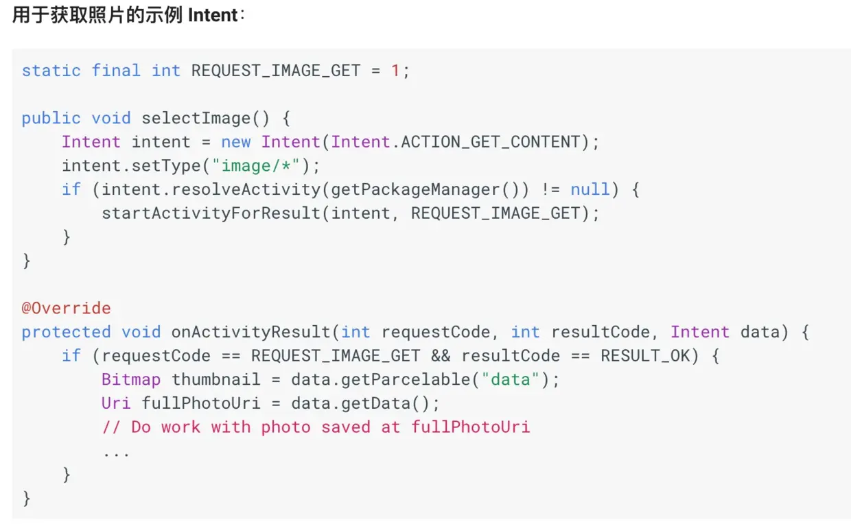 注:当您使用 ACTION_IMAGE_CAPTURE拍摄照片时,相机可能还会在结果 Intent 中返回缩小尺寸的照片副本(缩略图),这个副本以 Bitmap 形式保存在名为