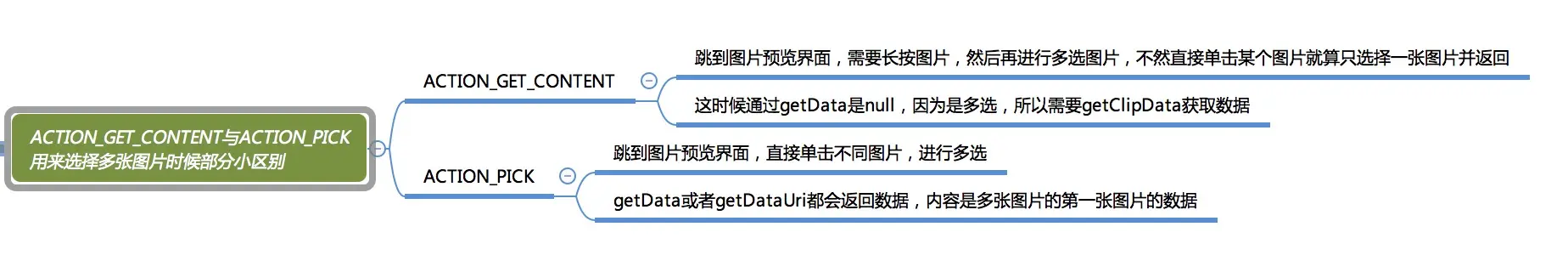 ps:最坑的是用ACTION_GET_CONTEN时候多选图片要长按操作,一直以为没成功,以为多选图片功能没实现,后来在 Android: Intent.EXTRA_ALLOW_MULTIPLE allows only single picking 上面找到别人的答案,说需要长按