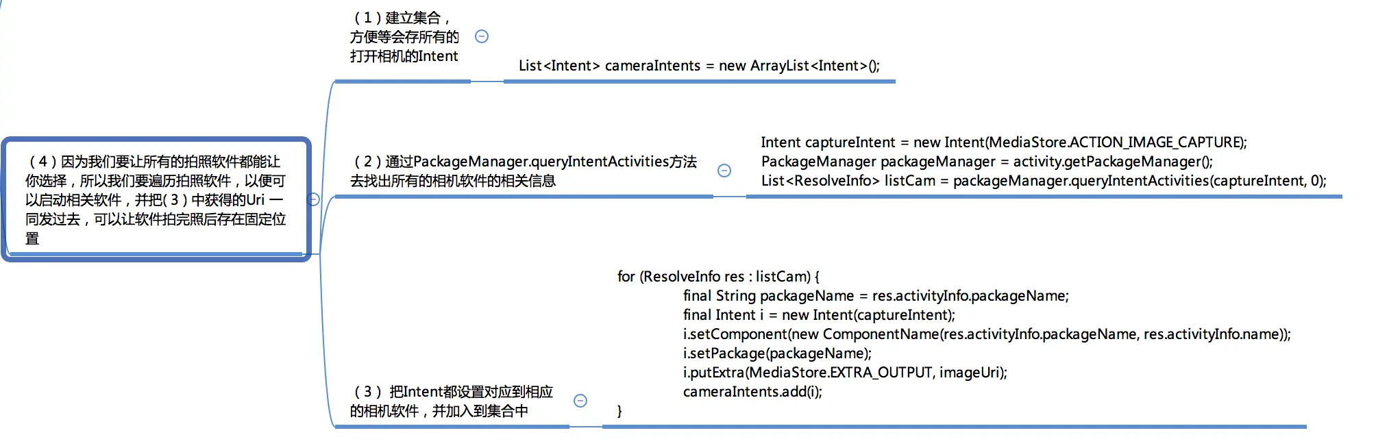 因为我们手机上面可能有很多个相机软件,所以我们需要先找到能打开各自相机软件的Intent,我们通过PackageManager.queryIntentActivities的方式来进行符合拍照Action的Intent的软件,然后得到它们具体的详细信息,比如包名及对应的activity名字等,然后把相应的Intent变得更加详细即可。