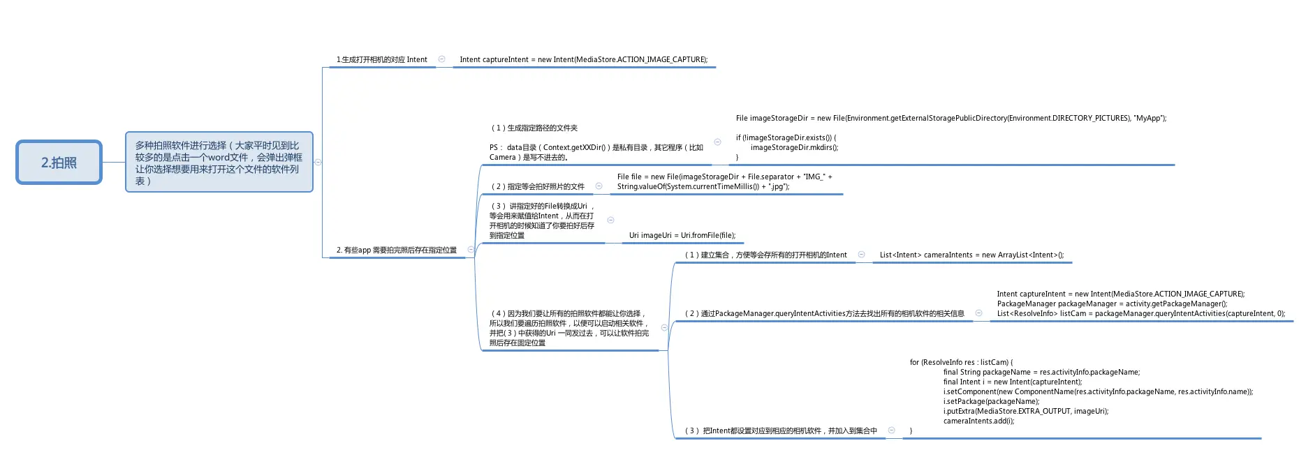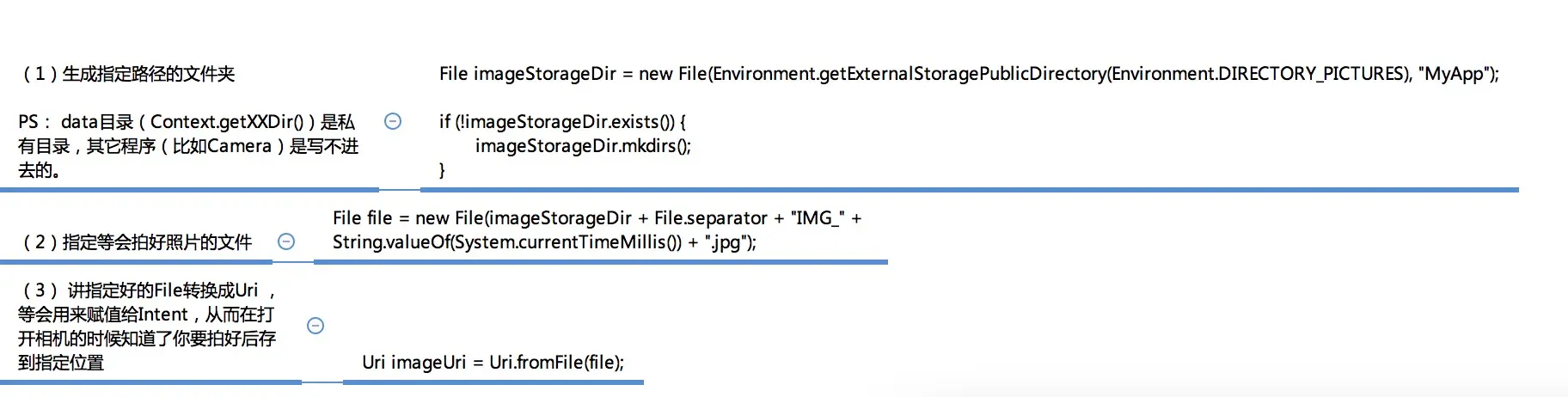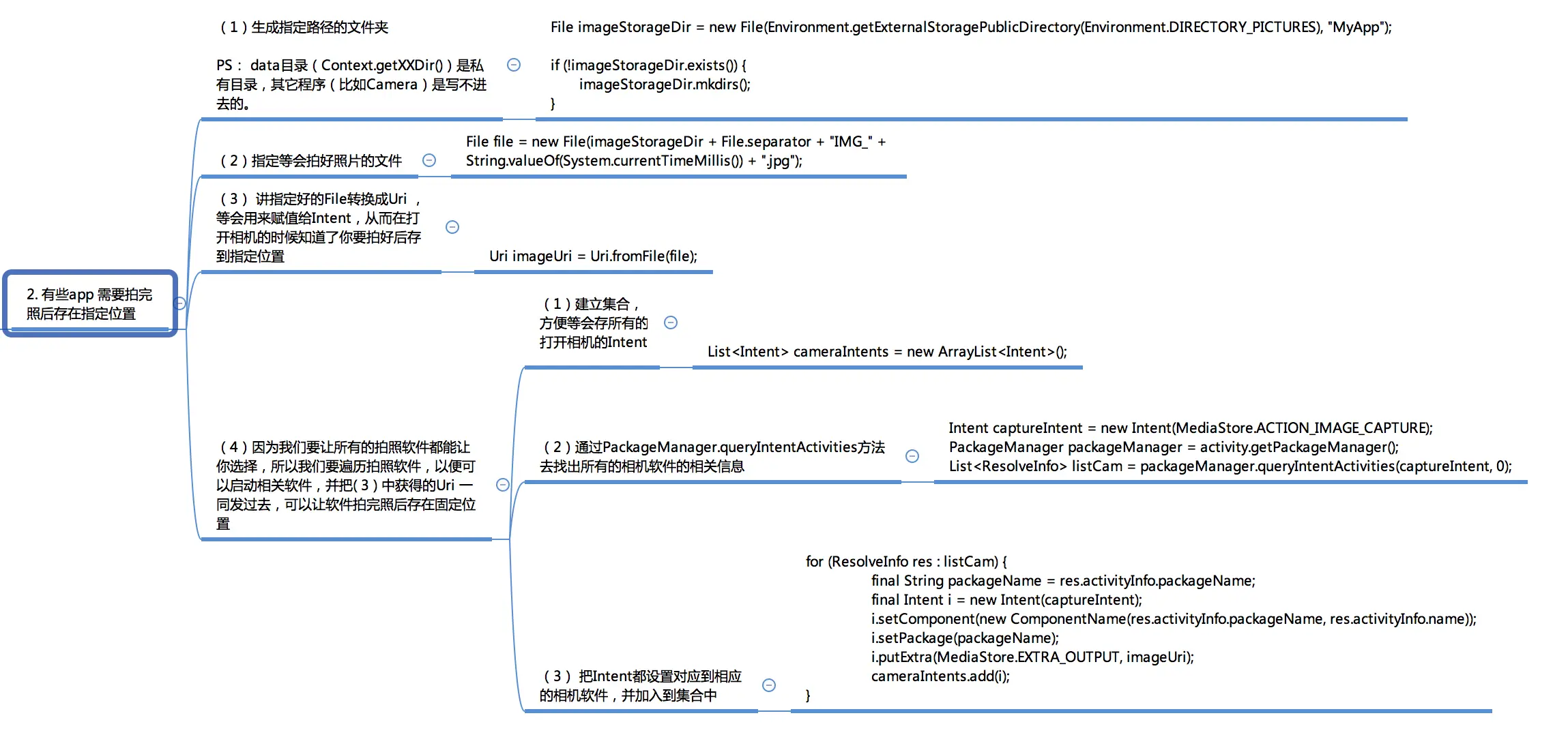 因为有些人需要在自己的APP中调用拍照的功能,存在自己指定的目录下面,所以需要在startActivity启动相机界面时候同时传递过去信息,告诉拍照了之后照片存的位置。