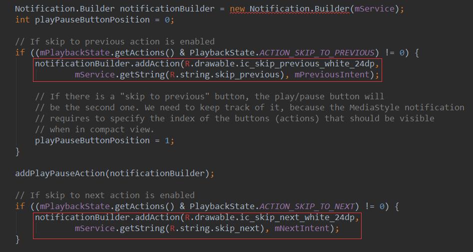 notificationBuilder.setStyle(new Notification.MediaStyle().setShowActionsInCompactView(playPauseButtonPosition) // show only play/pause in