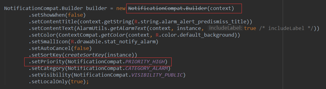 下面是AOSP上的DeskClock某个通知的构建,并未适配最新的通知渠道,可以看到构造方法被弃用