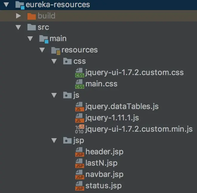 eureka-resources 模块,使用 JSP 实现 Eureka-Server 的运维后台界面。项目结构如下图: