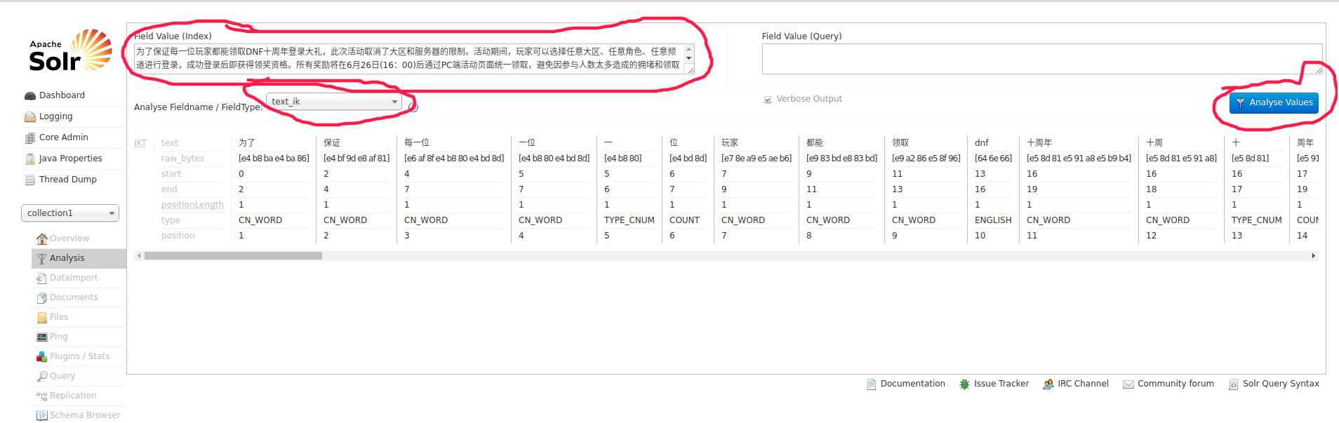 我们在左侧边栏的下拉列表core selector选中collection1, 这就是~/solrhome/collection1, 随后再选中Analysis, 我们从网上随便找一段话, 来试试中文分词的效果: