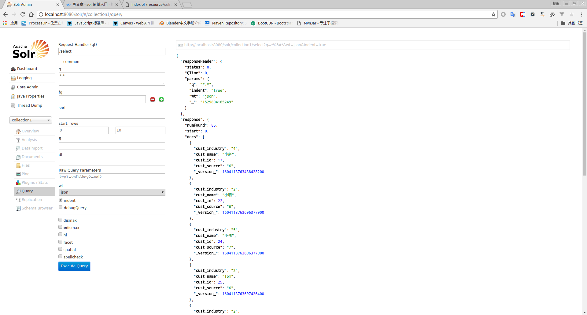 - q: 查询字符串, 必须有, 如果查询所有时使用*:*, 例如, cust_name为张三的数据: