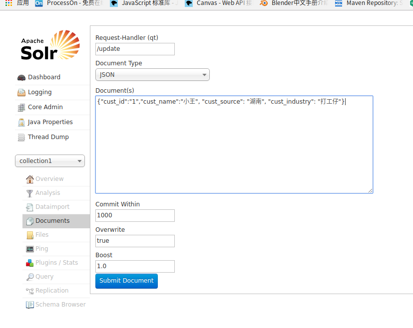 - 接下来, 我们需要将数据库中的数据导入到solr中的collection1中