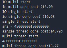 import threading import time class MyThread(threading.Thread): def __init__(self,func,args, name): super(MyThread,self).__init__() self.func = func self.args = args self.name = name def get_res(self): return self.result def run(self): self.result = self.func(*self.args) ###################### def sum1(start, end): ans = 0 for i in range(start,end+1) ans += i return ans # 执行写入操作 def openIO(end): for i in range(0,end): fd = open('1','w') fd.write('s') fd.close() # 单线程cpu def singleThread(start,end): print("sing thread start") t_start = time.time() ans = 0 for i in range(start,end+1): ans += i t_stop = time.time() print("ans = %d" % ans) print("single thread done cost:%.2fd" % (t_stop - t_start)) # 多线程 cpu def multiThread(): print("mutli thread start") t_start = time.time() nums = [(1, 100000000), (100000001, 200000000), (200000001, 300000000)] threads = [] for i in range(0,len(nums)): t = MyThread(sum1,nums[i], sum1.__name__) threads.append(t) for i in range(len(threads)): threads[i].join() ans += threads[i].get_res() t_end = time.time() print(ans) print("multi thread done cost:%.2f" % (t_end - t_start)) # CPU 运算 def CPUslove(): singleThread(1,300000000) multiThread() def IOSingle(): print("IO single start") t_start = time.time() openIO(55000) openIO(35000) t_end = time.time() print("io single done cost %.2f" % (t_end - t_start)) def IOMulti(): print("IO multi start") t_start = time.time() t1 = MyThread(openIO, (55000,),openIO.__name__) t2 = MyThread(openIO, (35000,),openIO.__name__) t1.start() t2.start() t1.join() t2.join() t_end = time.time() print("io multi done cost %.2f" % (t_end - t_start)) def IOSlove(): IOMulti() IOSingle() def main(): IOSlove() CPUSlove() if __name__ == '__main__': main() -