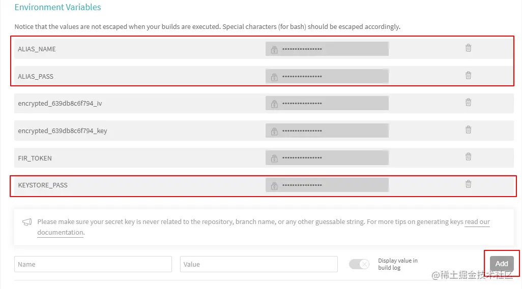 而我们最终要的效果,还是希望一份编译脚本既可以用于开发环境,也可以在CI环境下使用,在 Travis CI 中,可以通过点击 项目名称 -> Settings -> Environment Variables 中设置环境变量,比如我们可以针对上面的配置,分别设置 KEYSTORE_PASS 、 ALIAS_NAME 、 ALIAS_PASS 三个环境变量,可以通过下图所示的右下角的 Add 按钮增加环境变量: