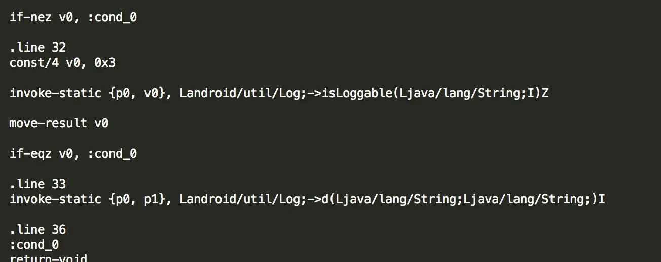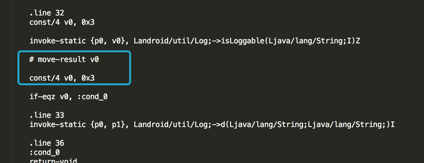 Log.d 能很轻松的定位修改位置。 if-eqz v0, :cond_0 #这句话的含义如果v0==0执行cond_0分支,执行cond_0分支就方法就结束了所以把v0值修改即可