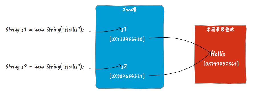 你可以简单的理解为String s1 = "Hollis";和 String s3 = new String("Hollis").intern();做的事情是一样的(但实际有些区别,这里暂不展开)。都是定义一个字符串对象,然后将其字符串字面量保存在常量池中,并把这个字面量的引用返回给定义好的对象引用。如下图: