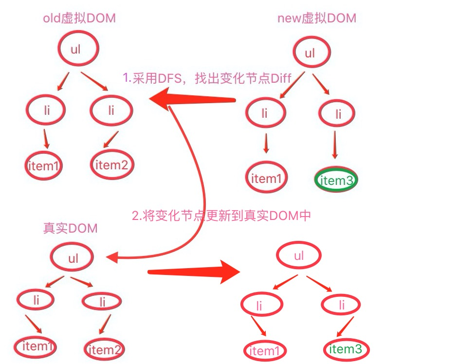 2. 当数据改变,引起DOM树结构发生改变,从而生成一颗新的虚拟DOM树,将其与之前的DOM对比,将变化部分应用到真实的DOM树中,即页面中。