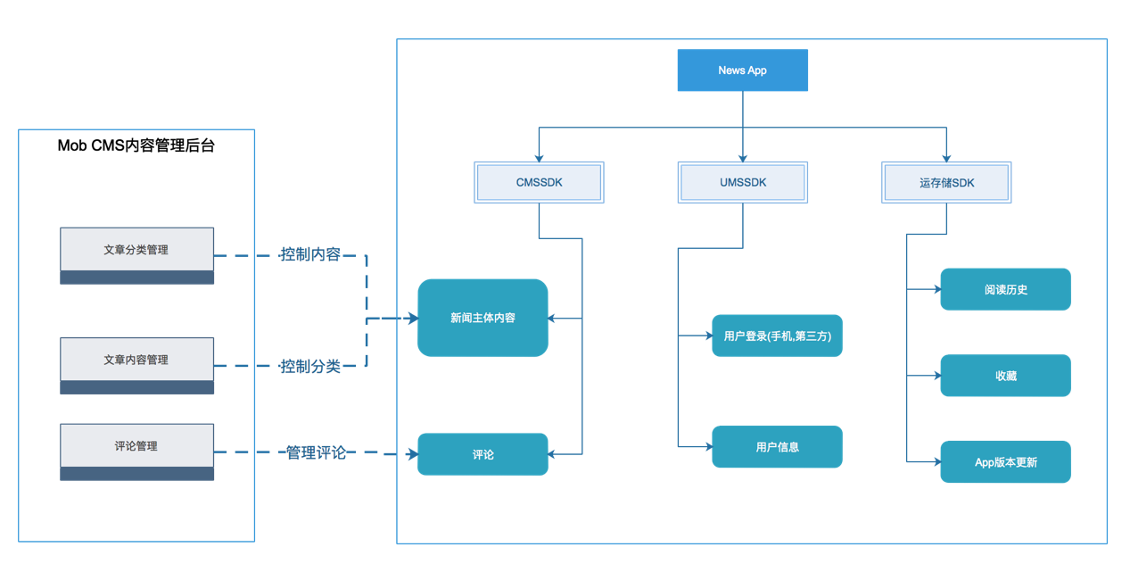 新闻类App中主要的部分-新闻内容,统一由Mob CMS内容管理后台来控制。通过在后台编写制作文章,发布文章后,App中就能够展示出所发布的文章。